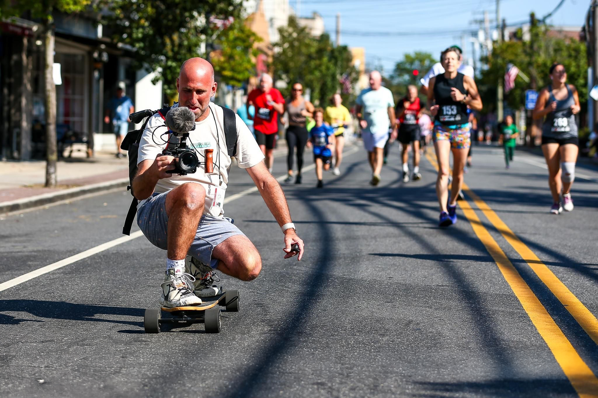 Instead of filming from the curb, I rolled with the runners. Weaving carefully along the course, matching pace, drifting ahead, falling back. It turned the coverage into something immersive. You are not observing effort from a distance. You are inside it.